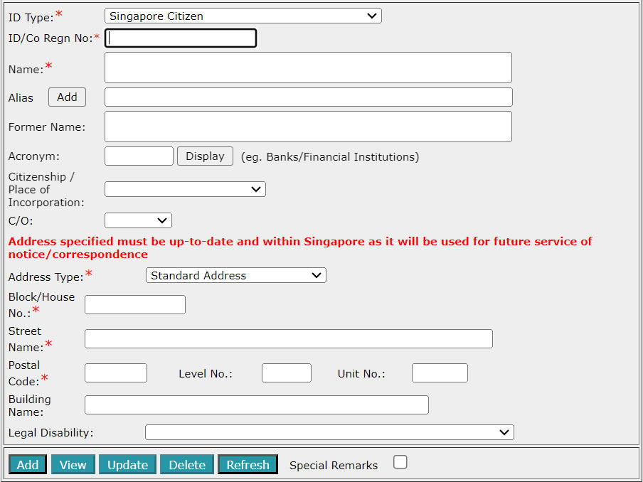 This section allows you to enter the details of the above parties. The compulsory data items are indicated by an * marked in red.